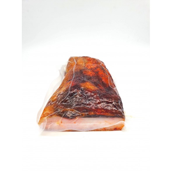 Il guanciale di suino viene squadrato, in seguito viene adagiato in contenitori e salato. Dopo alcuni giorni in salamoia si procede a lavarlo e condirlo con pepe nero macinato e peperone dolce in polvere, infine si procede alla stagionatura che durerà tra i 100 ed i 150 giorni.