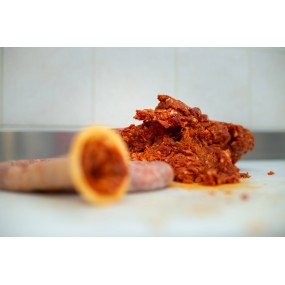 Carne di suino (spalla, pancetta, capocollo e prosciutto) macinata e poi miscelata con peperone dolce o piccante macinato in polvere, pepe nero macinato, semi di finocchietto selvatico e sale fino. L’impasto si fa riposare per qualche ora ed in seguito viene insaccato in un budello naturale di suino.